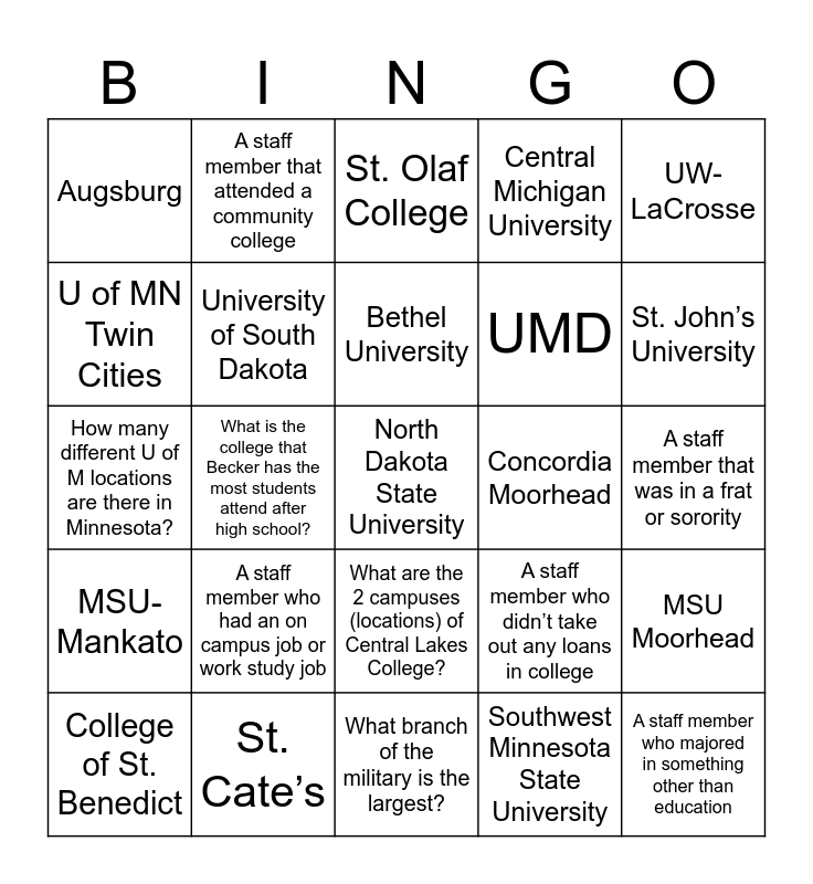 This bingo card has 61 words: Texas Tech University, St. Cate’s, St. Thomas, MSU- Mankato, Southwest Minnesota State University, St. Cloud State University, University of South Dakota, St. Mary’s University, UMD, Michigan State University, Central Michigan University, Gustavus Adolphus, U of MN Twin Cities, North Hennepin, Bemidji, Augsburg, North Dakota State University, UW- LaCrosse, American Band College of Central Washington University, Bethel University, Concordia Moorhead, St. Olaf College, College of St. Benedict, MSU Moorhead, Concordia St. Paul, Winona, UW Stevens Point, UW River Falls, St. John’s University, Hamline, What branch of the military uses the slogan “The Few. The Proud.”, A staff member who applied to only 1 college, What was Mr. Kreft’s major his freshman year of college at St. John’s?, A staff member who studied abroad, A staff member that attended a community college, Name the test students take when interested in the military, What is the newest branch of the military?, What is the college that Becker has the most students attend after high school?, What is the only university in Minnesota that offers a Technology Education program?, How many different U of M locations are there in Minnesota?, A staff member who applied to more than 5 colleges, A staff member who had an on campus job or work study job, A staff member that was in a frat or sorority, Name one of the most popular programs at St. Cloud Technical and Community College, A staff member who didn’t take out any loans in college, A staff member who was a first general college student, How many branches of the military are there?, A staff member that joined an on campus club or group, A staff member who was in band, choir or theater in college, What are the 2 campuses (locations) of Central Lakes College?, What branch of the military is the largest?, Name an athletic team that St. Cloud Tech and Community College offers, A staff member that changed their major more than once, A staff member who keeps in touch with their freshman year roommate, A staff member that played intramural sports, Name the placement test students take at St. Cloud Tech and Community College, A staff member who transferred colleges, A staff member who went to college out of state, Name 1 of the 5 residence halls at MSU Mankato, A staff member who majored in something other than education and Name a staff member who has served in a branch of the military.