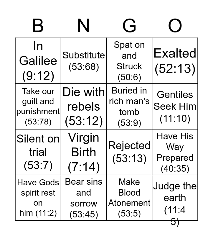 This bingo card has a free space and 15 words: Have Gods spirit rest on him (11:2), Judge the earth (11:4 5), Spat on and Struck (50:6), In Galilee (9:12), Gentiles Seek Him (11:10), Take our guilt and punishment (53:78), Virgin Birth (7:14), Make Blood Atonement (53:5), Die with rebels (53:12), Silent on trial (53:7), Have His Way Prepared (40:35), Exalted (52:13), Buried in rich man's tomb (53:9), Substitute (53:68) and Bear sins and sorrow (53:45).