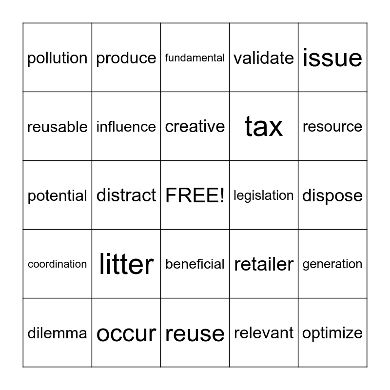 This bingo card has a free space and 39 words: interactive, social, violent, influence, dilemma, beneficial, creative, debris, issue, coordination, distract, validate, optimize, dispose, legislation, litter, pollute, pollution, recycle, retailer, reusable, reuse, tax, resource, support, supporter, decompose, toxic, consumer, produce, production, industry, fundamental, occur, relevant, durable, generation, potential and ineffective.