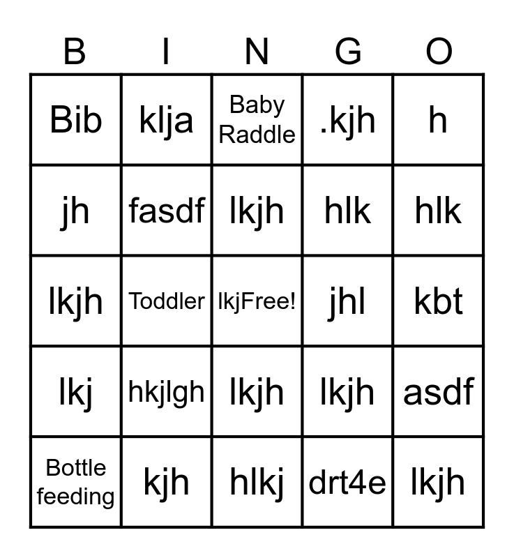 This bingo card has a free space and 29 words: Bottle feeding, Soother, Toddler, Toys, Bib, Baby Raddle, fasdf, hkjlgh, jhl, kjh, kbt, lkjh, hlkj, drt4e, hlk, jh, lkjh, lkj, h, lkjh, lkjh, lkj, hlk, jh, .kjh, klja, asdf, lkjh and lasdf.