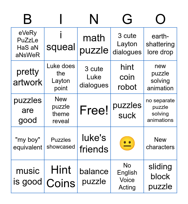 This bingo card has a free space and 24 words: Puzzles showcased, Hint Coins, 3 cute Luke dialogues, music is good, earth-shattering lore drop, eVeRy PuZzLe HaS aN aNsWeR, pretty artwork, i squeal, puzzles suck, luke's friends, hint coin robot, puzzles are good, 😐, New characters, Luke does the Layton point, No English Voice Acting, no separate puzzle solving animations, math puzzle, new puzzle solving animation, New puzzle theme reveal, sliding block puzzle, "my boy" equivalent, 3 cute Layton dialogues and balance puzzle.