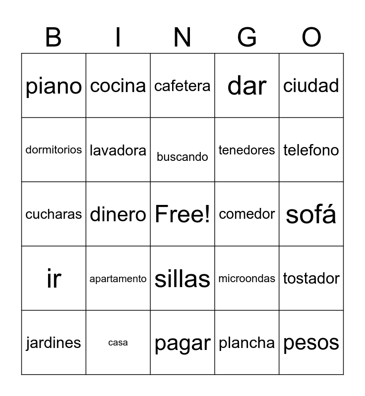This bingo card has a free space and 24 words: apartamento, casa, buscando, jardines, ciudad, piano, dormitorios, cocina, comedor, sillas, tenedores, cucharas, microondas, tostador, lavadora, plancha, sofá, cafetera, telefono, dinero, pesos, ir, dar and pagar.