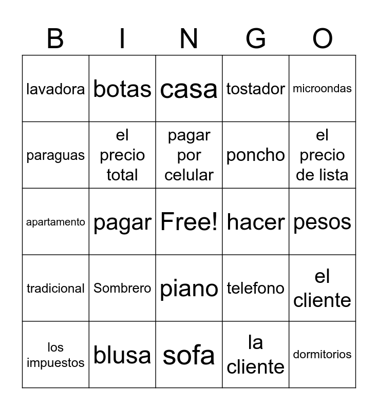 This bingo card has a free space and 24 words: Sombrero, blusa, pagar por celular, los impuestos, microondas, lavadora, paraguas, botas, hacer, piano, poncho, apartamento, telefono, el cliente, el precio total, la cliente, pesos, casa, el precio de lista, pagar, dormitorios, tradicional, tostador and sofa.