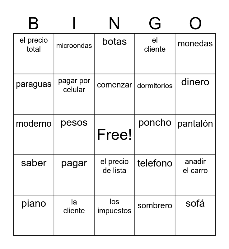 This bingo card has a free space and 24 words: pagar, la cliente, comenzar, piano, monedas, el precio total, paraguas, microondas, poncho, el precio de lista, dormitorios, moderno, telefono, anadir el carro, pagar por celular, sombrero, pantalón, botas, dinero, pesos, sofá, saber, el cliente and los impuestos.