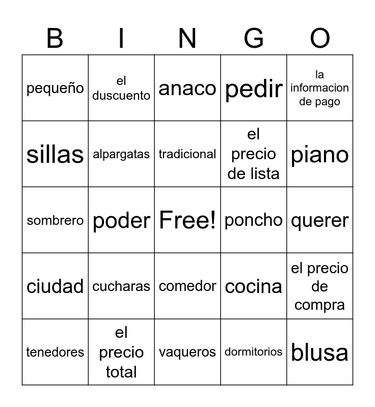 This bingo card has a free space and 24 words: cucharas, el precio total, tradicional, tenedores, la informacion de pago, pequeño, sillas, el duscuento, poncho, comedor, el precio de lista, sombrero, cocina, el precio de compra, alpargatas, dormitorios, querer, anaco, piano, poder, blusa, ciudad, pedir and vaqueros.