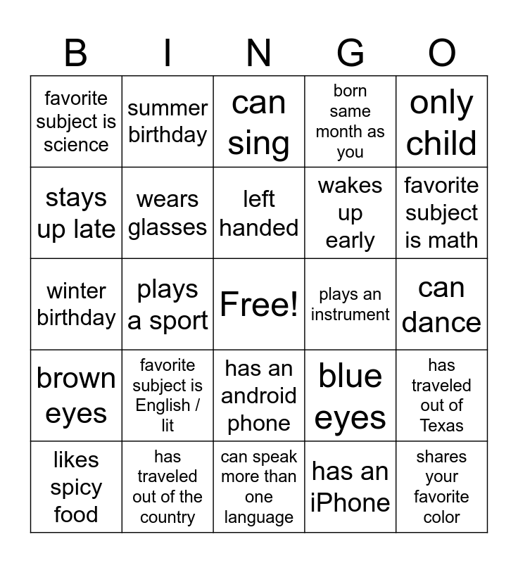 This bingo card has a free space and 36 words: has a dog, has a cat, over 5'7", wears glasses, blue eyes, brown eyes, left handed, can roll tongue, only child, has siblings, plays a sport, born same month as you, enjoys reading, plays an instrument, favorite subject is math, favorite subject is science, favorite subject is history, favorite subject is English / lit, shares your favorite color, can sing, can dance, has traveled out of Texas, has traveled out of the country, likes spicy food, can speak more than one language, summer birthday, winter birthday, broken a bone, wakes up early, stays up late, can whistle, can use chopsticks, has an iPhone, has an android phone, has met a famous person and never had a cavity.