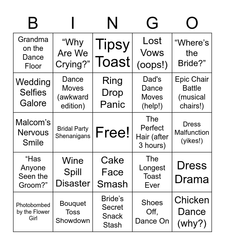 This bingo card has a free space and 40 words: Ashley’s Happy Tears, Malcom’s Nervous Smile, Cold Feet (just kidding!), Dance Moves (awkward edition), Bouquet Toss Showdown, Cake Face Smash, Ring Drop Panic, Uncle Bob’s Speech (uh oh...), “Where’s the Bride?”, “Has Anyone Seen the Groom?”, Bridal Party Shenanigans, Lost Vows (oops!), Chicken Dance (why?), Dress Malfunction (yikes!), The Perfect Hair (after 3 hours), Wine Spill Disaster, The Look (you know the one), Grandma on the Dance Floor, Dance Battle!, Tipsy Toast, Dress Drama, Shoes Off, Dance On, Dad's Dance Moves (help!), Wedding Selfies Galore, Champagne Problems, Last-Minute Ring Check, Missing Bridesmaid (found in the bar!), “What Time’s the Open Bar?”, Toast Gone Wrong, “Who Invited Them?”, Is the Mic On?”, Photobombed by the Flower Girl, DJ’s Questionable Playlist, The Longest Toast Ever, Epic Chair Battle (musical chairs!), Bride’s Secret Snack Stash, Groom’s Hidden Flask, Dance Floor Slip (graceful recovery), “Why Are We Crying?” and Wedding Hashtag Fails (#Oops).