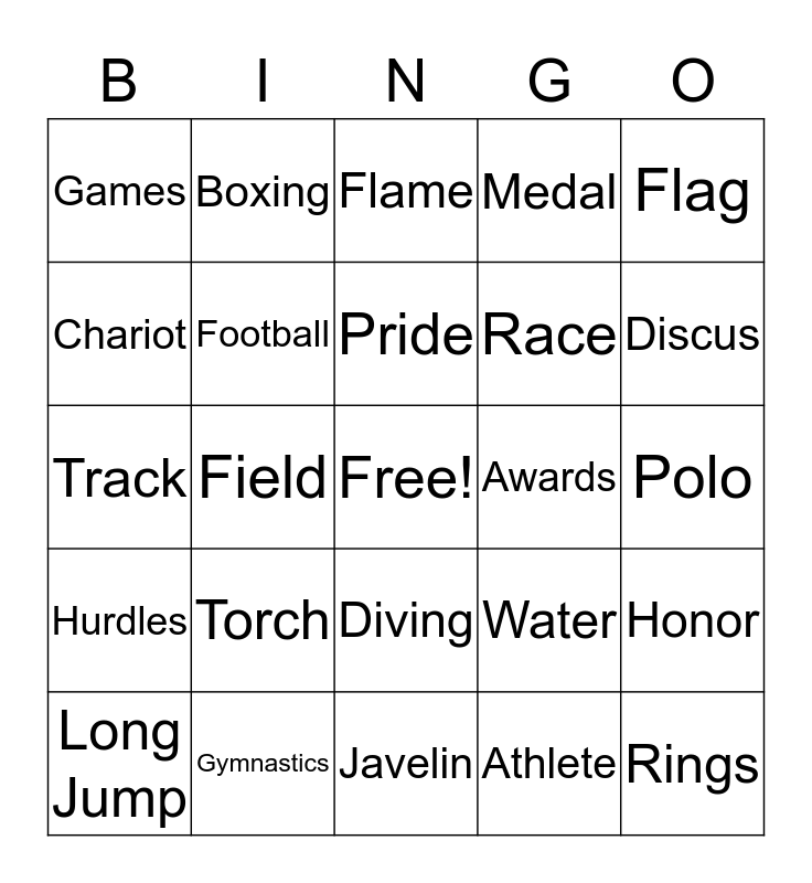 This bingo card has a free space and 24 words: Torch, Gymnastics, Pride, Long Jump, Flag, Games, Chariot, Boxing, Awards, Diving, Race, Track, Water, Honor, Football, Athlete, Polo, Flame, Discus, Field, Rings, Hurdles, Medal and Javelin.