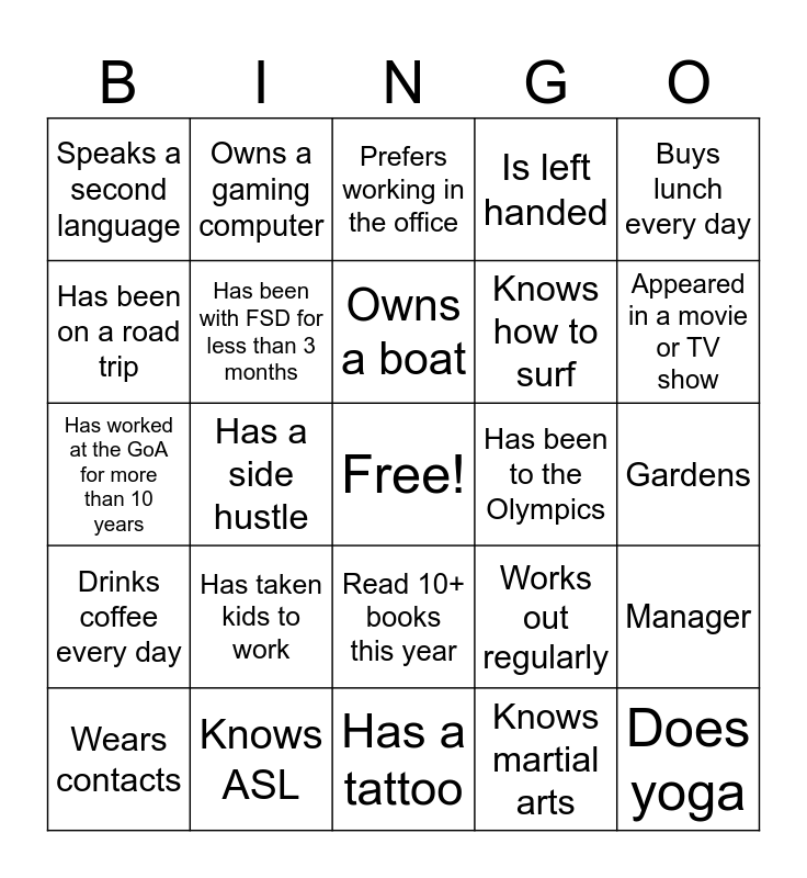 This bingo card has a free space and 24 words: Has taken kids to work, Knows ASL, Owns a boat, Wears contacts, Buys lunch every day, Speaks a second language, Has been on a road trip, Owns a gaming computer, Has been to the Olympics, Read 10+ books this year, Knows how to surf, Has worked at the GoA for more than 10 years, Works out regularly, Manager, Has been with FSD for less than 3 months, Knows martial arts, Gardens, Prefers working in the office, Appeared in a movie or TV show, Has a side hustle, Does yoga, Drinks coffee every day, Is left handed and Has a tattoo.