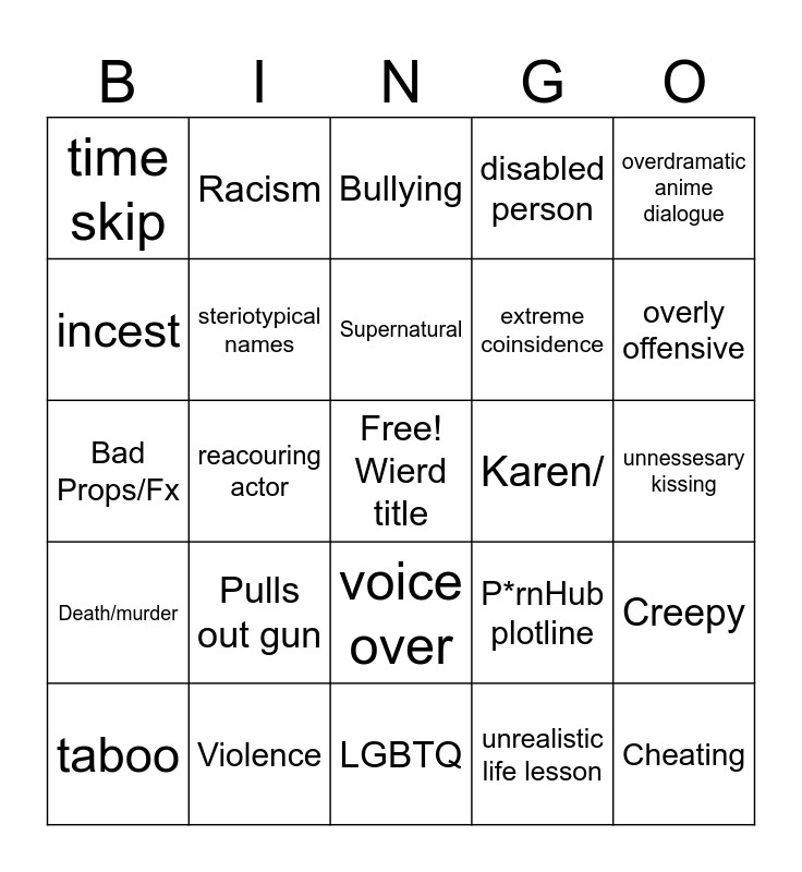 This bingo card has a free space and 24 words: Pulls out gun, Violence, Supernatural, taboo, overdramatic anime dialogue, time skip, incest, Racism, Karen/, voice over, extreme coinsidence, Bad Props/Fx, P*rnHub plotline, Creepy, steriotypical names, unrealistic life lesson, unnessesary kissing, Bullying, overly offensive, reacouring actor, Cheating, Death/murder, disabled person and LGBTQ.