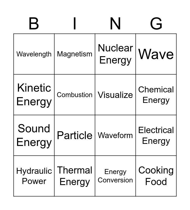 This bingo card has 46 words: Model, Particle, Pattern, Source, Transfer, Vibrate, Visualize, Amplitude, Wavelength, Collision, Waveform, Wave, Communicate, Energy, Explanation, Material, Kinetic Energy, Thermal Energy, Light Energy, Chemical Energy, Sound Energy, Potential Energy, Nuclear Energy, Electrical Energy, Photosynthesis, Combustion, Friction, Solar Panels, Battery, Falling Objects, Generator, Wind Energy, Geothermal Energy, Rocket Launch, Charging Phone, Cooking Food, Hydraulic Power, Biomass Energy, Radiant Energy, Hydroelectric, Fireworks, Magnetism, Energy Conversion, Electric Car, Gasoline Engine and Sound Waves.