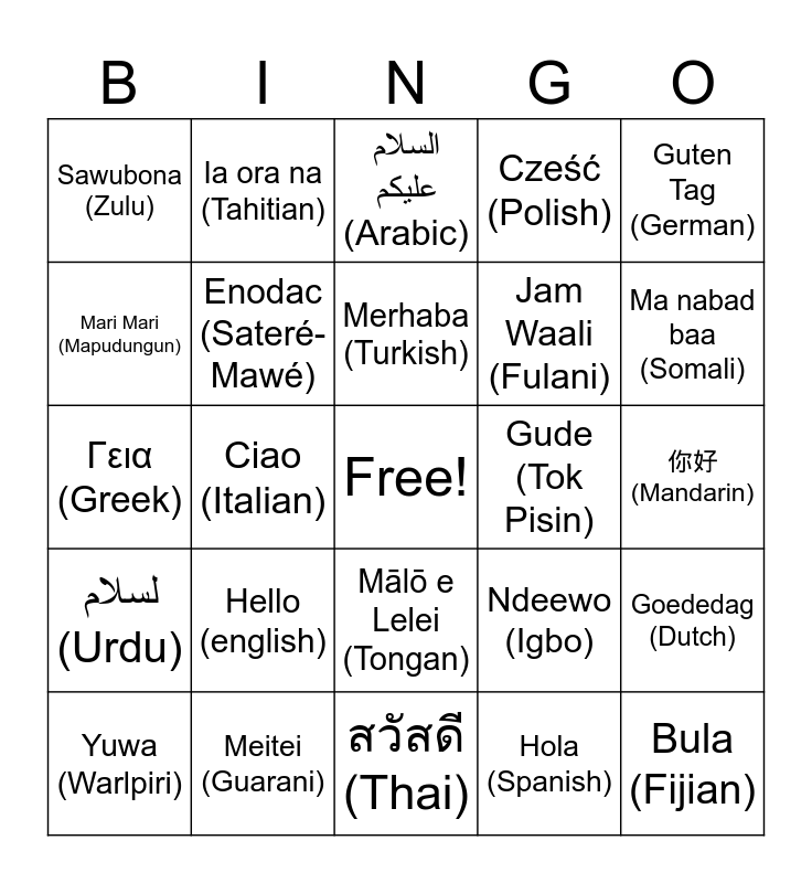This bingo card has a free space and 53 words: Kia ora (Maori), Bula (Fijian), Kamisaraki (Aymara), Hola (Spanish), Hello (english), Goeie Dag (Afrikaans), Ia ora na (Tahitian), Dumela (Sesotho), Mari Mari (Mapudungun), Wademi Tawa (Yanomami), Enodac (Sateré-Mawé), Bonjour (French), Goededag (Dutch), Ndeewo (Igbo), Oi (Brazilian Portuguese), Yuwa (Warlpiri), Merhaba (Turkish), Gude (Tok Pisin), Rimaykullayki (Quechua), Guten Tag (German), Ciao (Italian), Saqarik (K'iche'), Jam Waali (Fulani), Sawubona (Zulu), Sannu (Hausa), Meitei (Guarani), Aluu (Greenlandic), Hej (Swedish), Aloha (Hawaiian), Ma nabad baa (Somali), Halo (Javanese and Indonesian), Habari (Swahili), Bonjou (Haitian Creole), Bawo (Yoruba), Iorena (Rapa Nui), 今日は (Japanese), Cześć (Polish), สวัสดี (Thai), السلام عليكم (Arabic), नमस्ते (Hindu), Tālofa (Samoan), ሰላም (Amharic), 你好 (Mandarin), 안녕하세요 (Korean), שלום (Hebrew), Mālō e Lelei (Tongan), привет (Russian), ᎣᏏᏲ (Cherokee), Γεια (Greek), لسلام (Urdu), Yá’áá’ééh (Navajo), ᐊᐃ (Inuktitut) and Kotáka (Enga).