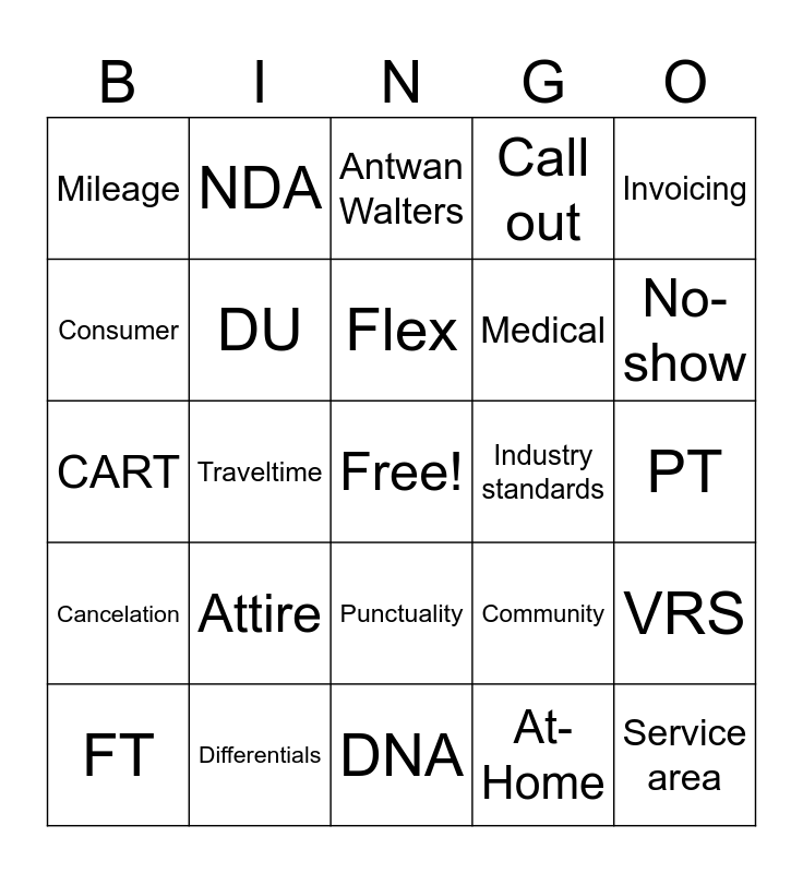 This bingo card has a free space and 29 words: KPI, Differentials, Antwan Walters, Teaming, Invoicing, Mileage, DU, Flex, Industry standards, VRS, FT, Traveltime, At-Home, Service area, CART, HIPPA, DNA, Community, No-show, Cancelation, Attire, Captioning, Medical, PT, Consumer, NDA, Punctuality, Call out and Best practices.