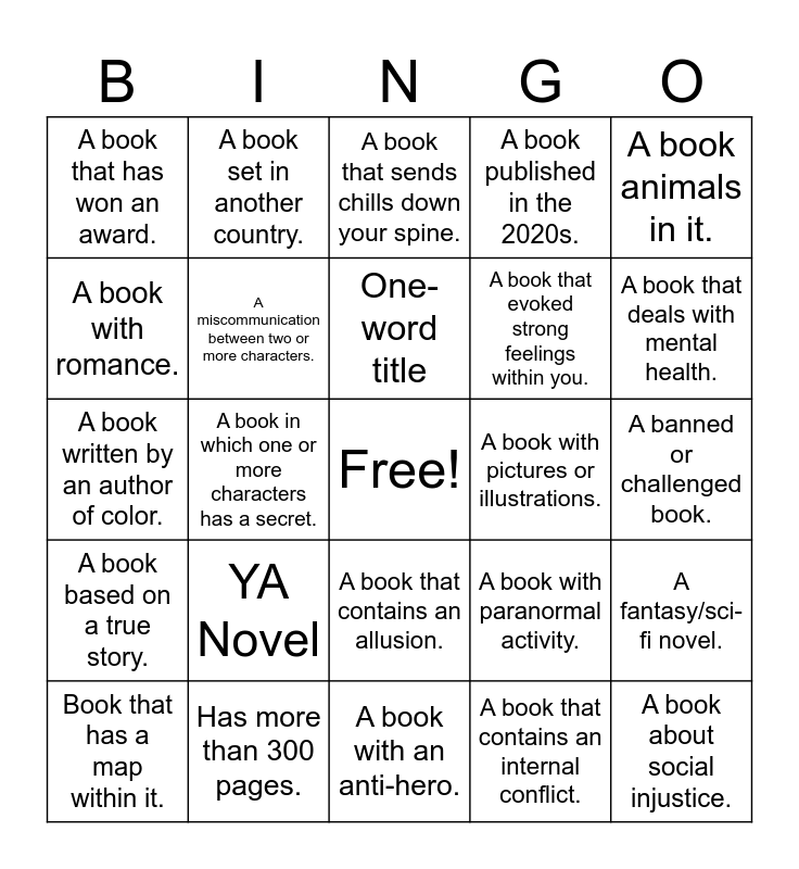 This bingo card has a free space and 24 words: YA Novel, Has more than 300 pages., One-word title, Book that has a map within it., A book animals in it., A book that has won an award., A book with romance., A book set in another country., A book with pictures or illustrations., A book that contains an allusion., A book that evoked strong feelings within you., A book written by an author of color., A book with paranormal activity., A fantasy/sci-fi novel., A miscommunication between two or more characters., A book that contains an internal conflict., A banned or challenged book., A book that sends chills down your spine., A book that deals with mental health., A book in which one or more characters has a secret., A book about social injustice., A book based on a true story., A book published in the 2020s. and A book with an anti-hero..
