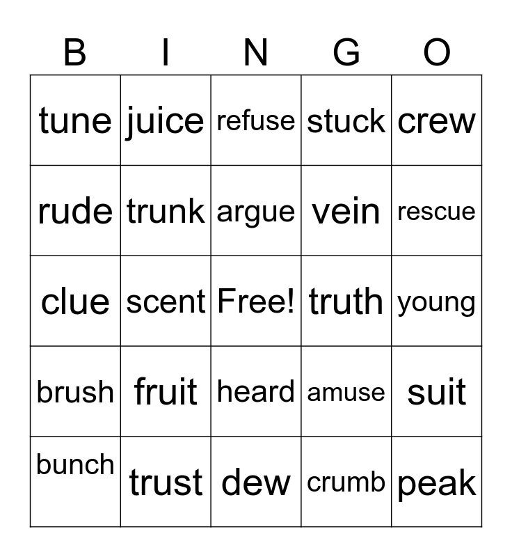 This bingo card has a free space and 24 words: bunch, fruit, argue, crumb, crew, tune, juice, refuse, truth, young, clue, trunk, amuse, suit, rude, trust, dew, stuck, rescue, brush, scent, heard, vein and peak.