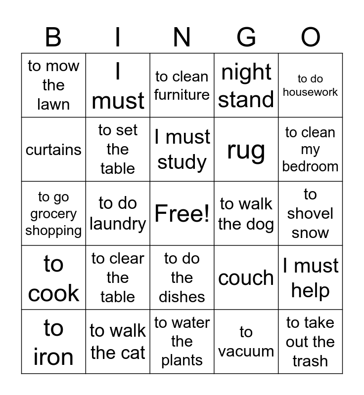 This bingo card has a free space and 29 words: to iron, to watch a child, to do laundry, to make the bed, to mow the lawn, to clean furniture, to set the table, to clear the table, to walk the dog, to walk the cat, to shovel snow, to take out the trash, to water the plants, to vacuum, to clean my bedroom, to wash the car, to do the dishes, to cook, to do housework, to go grocery shopping, couch, armchair, rug, curtains, night stand, I must, I must help, I must study and I must speak French.