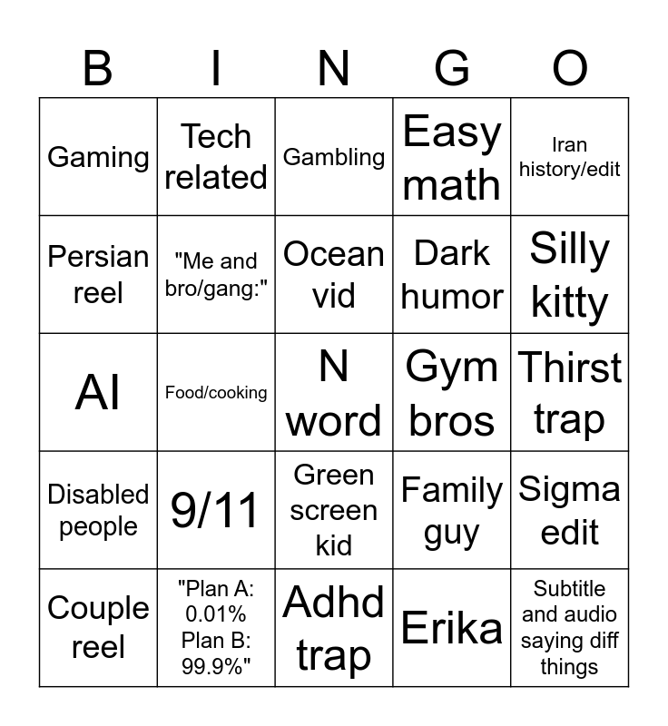 This bingo card has a free space and 24 words: 9/11, "Plan A: 0.01% Plan B: 99.9%", Ocean vid, Couple reel, Iran history/edit, Gaming, Persian reel, Tech related, Gym bros, Green screen kid, Dark humor, AI, Family guy, Sigma edit, "Me and bro/gang:", Erika, Thirst trap, Gambling, Silly kitty, Food/cooking, Subtitle and audio saying diff things, Disabled people, Easy math and Adhd trap.