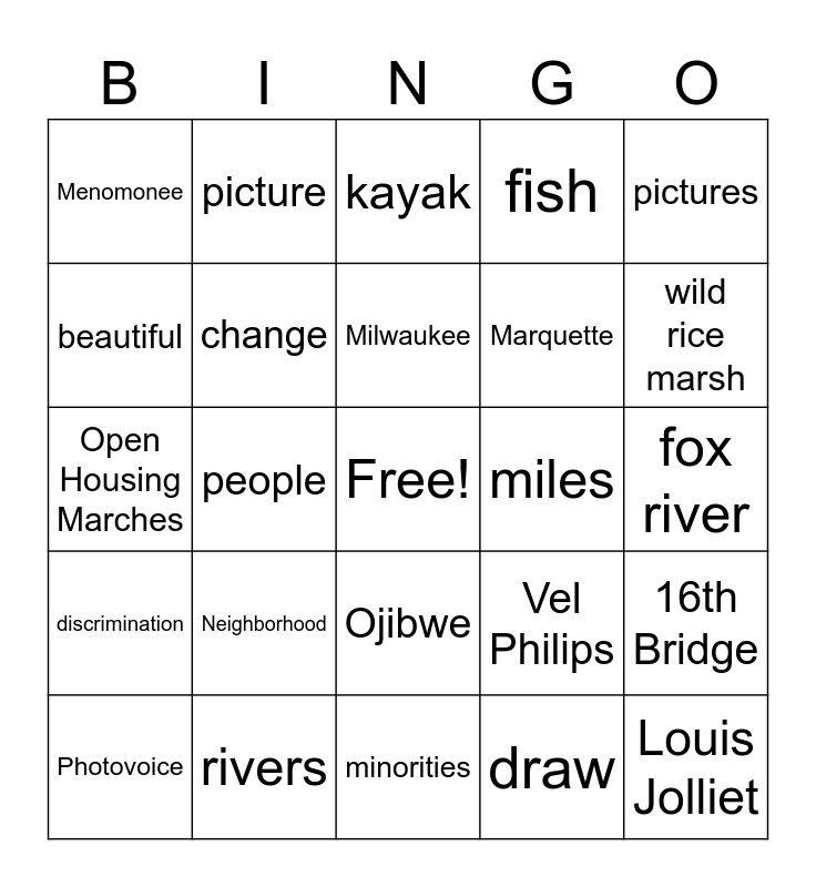 This bingo card has a free space and 24 words: Neighborhood, rivers, Milwaukee, Photovoice, pictures, Menomonee, beautiful, picture, miles, Ojibwe, Marquette, Open Housing Marches, Vel Philips, 16th Bridge, change, draw, fox river, kayak, wild rice marsh, people, Louis Jolliet, discrimination, fish and minorities.