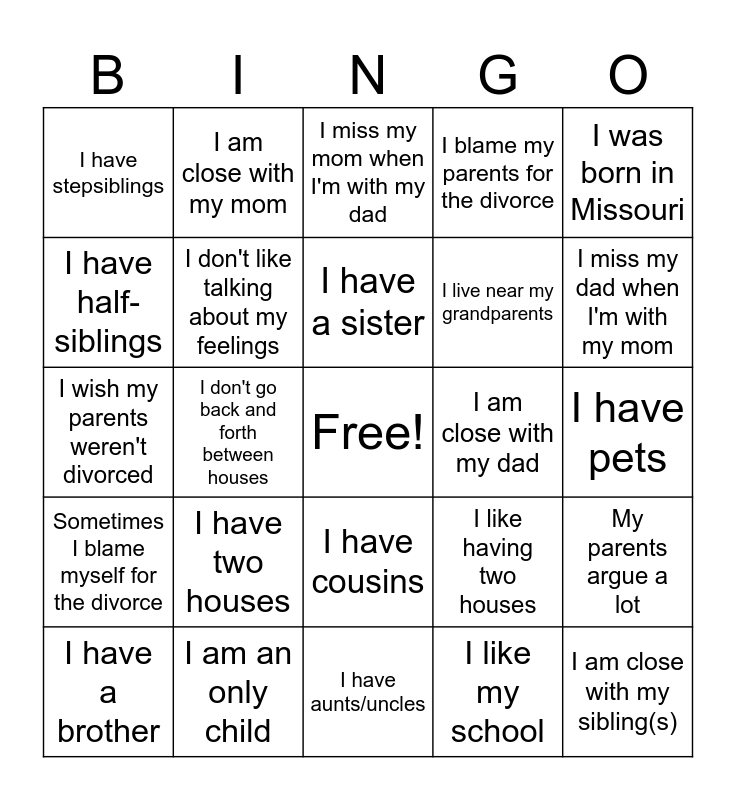This bingo card has a free space and 24 words: I have two houses, I am an only child, I have a sister, I have a brother, I was born in Missouri, I have stepsiblings, I have half-siblings, I am close with my mom, I am close with my dad, I have cousins, I live near my grandparents, I wish my parents weren't divorced, I like having two houses, My parents argue a lot, I don't like talking about my feelings, I like my school, I have pets, I miss my mom when I'm with my dad, I miss my dad when I'm with my mom, I don't go back and forth between houses, I am close with my sibling(s), Sometimes I blame myself for the divorce, I blame my parents for the divorce and I have aunts/uncles.