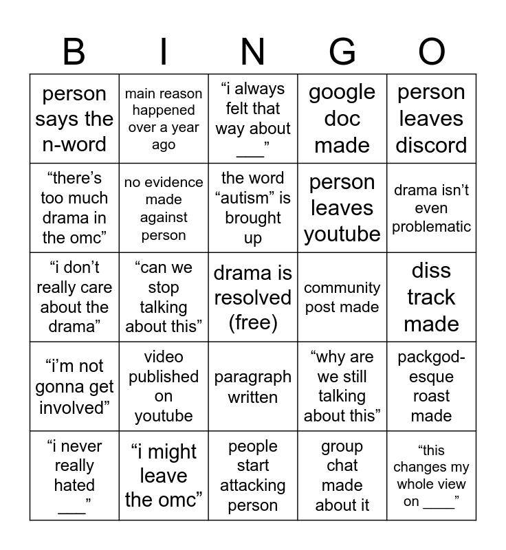 This bingo card has a free space and 24 words: video published on youtube, “i might leave the omc”, the word “autism” is brought up, “i never really hated ___”, person leaves discord, person says the n-word, “there’s too much drama in the omc”, main reason happened over a year ago, community post made, paragraph written, person leaves youtube, “i don’t really care about the drama”, “why are we still talking about this”, packgod-esque roast made, no evidence made against person, group chat made about it, diss track made, “i always felt that way about ___”, drama isn’t even problematic, “can we stop talking about this”, “this changes my whole view on ____”, “i’m not gonna get involved”, google doc made and people start attacking person.
