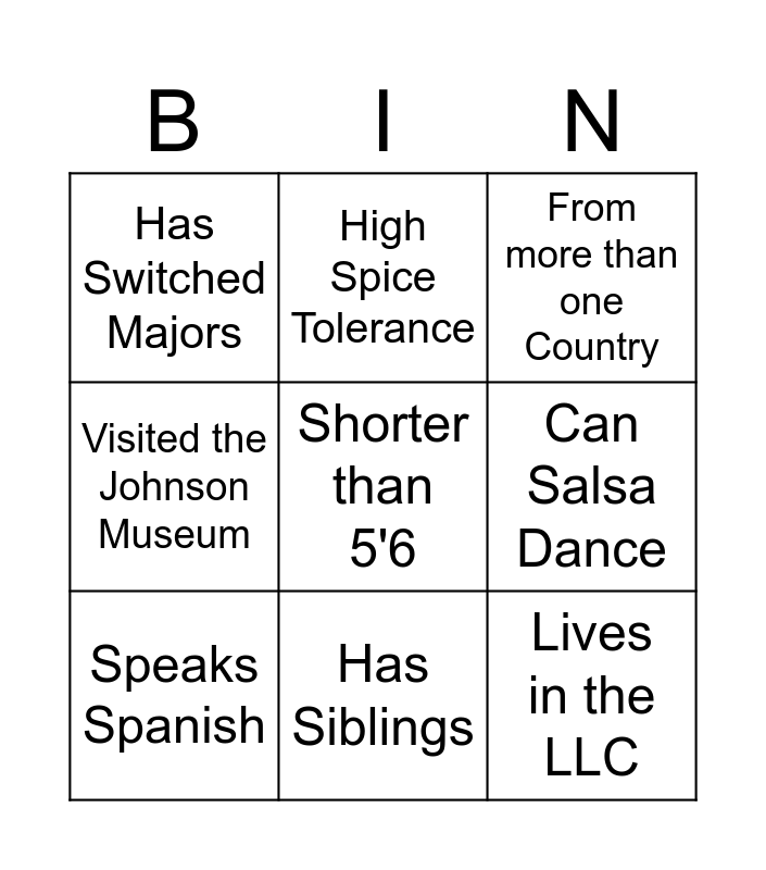 This bingo card has a free space and 8 words: Can Salsa Dance, From more than one Country, High Spice Tolerance, Speaks Spanish, Has Switched Majors, Lives in the LLC, Visited the Johnson Museum and Has Siblings.
