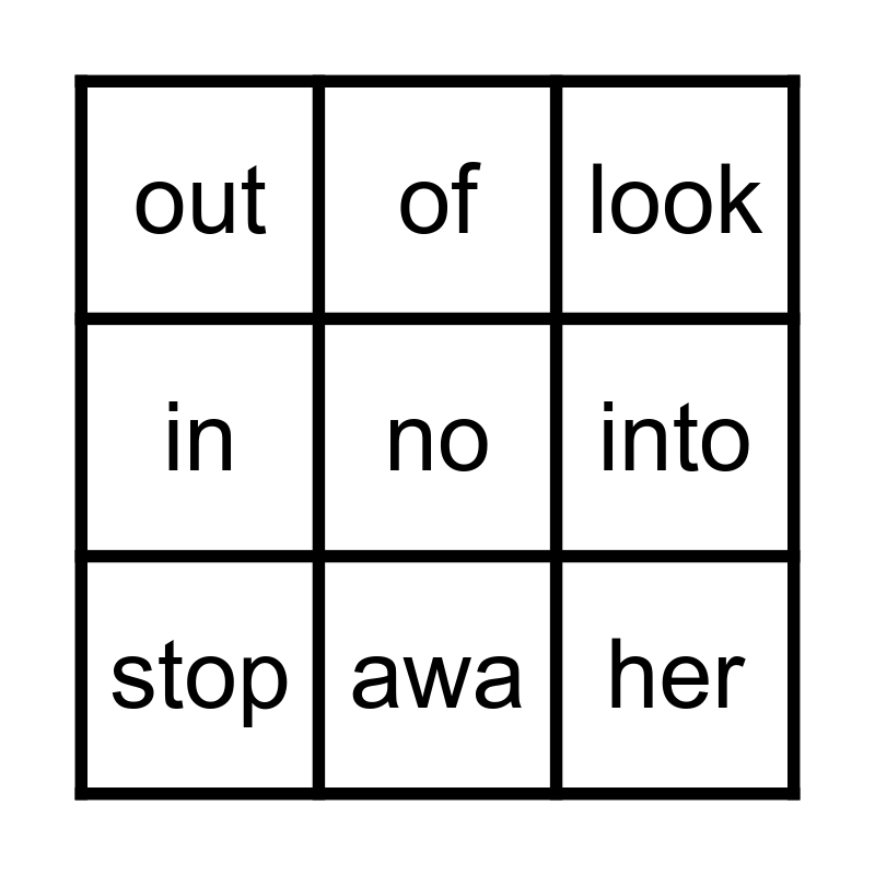 This bingo card has 14 words: sees, off, stop, of, in, no, her, me, awa, out, ka pai, into, look and they.