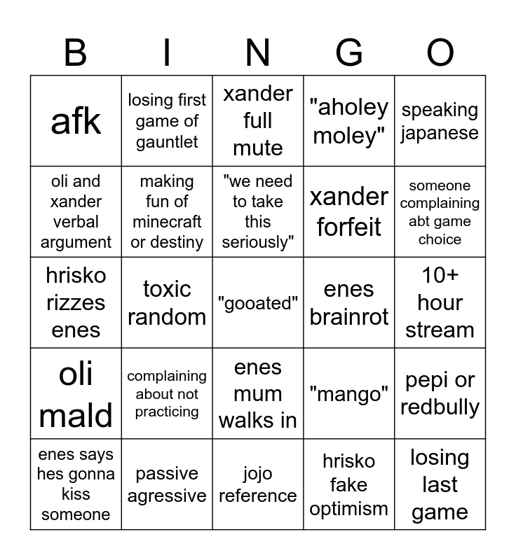 This bingo card has a free space and 24 words: complaining about not practicing, passive agressive, "we need to take this seriously", enes says hes gonna kiss someone, speaking japanese, afk, oli and xander verbal argument, losing first game of gauntlet, enes brainrot, enes mum walks in, xander forfeit, hrisko rizzes enes, "mango", pepi or redbully, making fun of minecraft or destiny, hrisko fake optimism, 10+ hour stream, xander full mute, someone complaining abt game choice, toxic random, losing last game, oli mald, "aholey moley" and jojo reference.