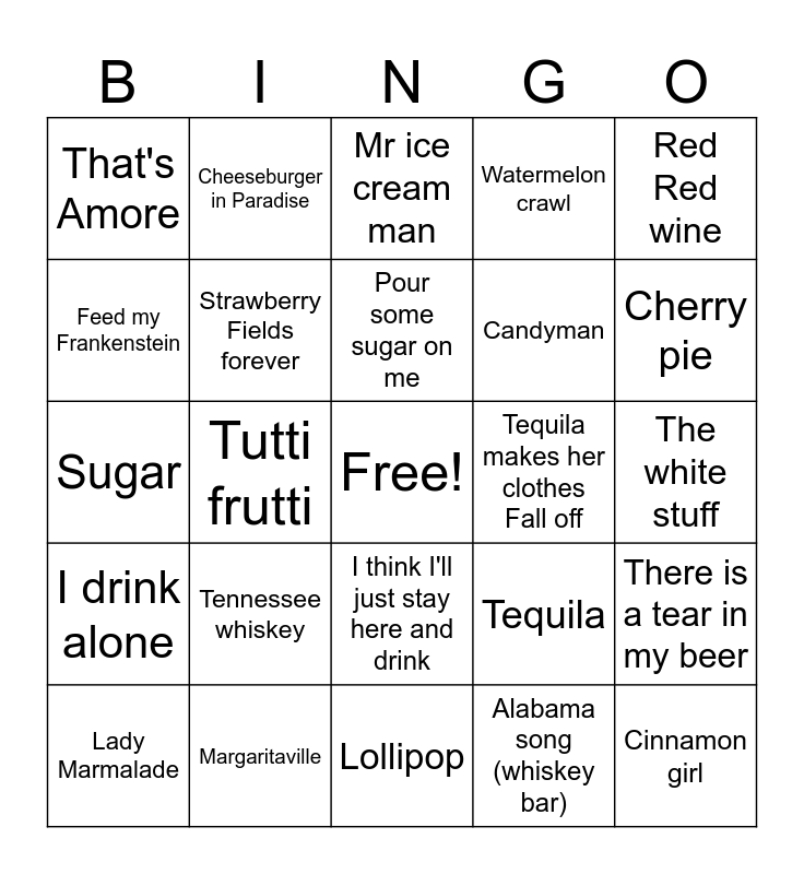 This bingo card has a free space and 41 words: Buttermilk biscuits, Sugar, Hey good looking, Strawberry Fields forever, Margaritaville, I think I'll just stay here and drink, Pour some sugar on me, I can't help myself sugar pie honey bun, Red Red wine, I drink alone, Tutti frutti, Watermelon crawl, Cinnamon girl, The white stuff, Tequila makes her clothes Fall off, Tennessee whiskey, No sugar Tonight, That's Amore, Hunger strike, Mr ice cream man, There is a tear in my beer, I'm your gummy bear, Lollipop, Candyman, Bread and butter, Jambalaya, Alabama song (whiskey bar), Ice cream man, Cherry pie, Drinking bone, Eat it, Cheeseburger in Paradise, Lady Marmalade, Cherry bomb, Tequila, Feed my Frankenstein, Bar b q, One Bourbon One Scotch One beer, Peaches, Brown sugar and Whiskey River.