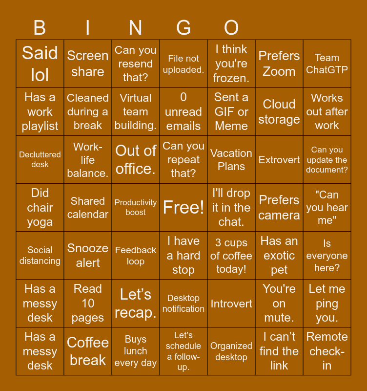 This bingo card has a free space and 101 words: Can you hear me?, You're on mute., I think you're frozen., Technical difficulties., Let's circle back., I'll follow up., Can we take this offline?, Wi-Fi issues., You're cutting out., Can everyone see my screen?, Quick question., Zoom fatigue., Let’s schedule a follow-up., I'll drop it in the chat., Sorry, I was on mute., Is everyone here?, Work-life balance., I need coffee., Home office., Who has the agenda?, I’ll circle back on that., Email me., Let me ping you., Camera on., Let’s recap., Virtual team building., File not uploaded., Out of office., Internet outage, Can I call you?, Screen share, Can you resend that?, I’ll check on that, Coffee break, I have a hard stop, Can you repeat that?, Quick recap, Zoom background, Productivity boost, Shared calendar, I can’t find the link, Can you update the document?, Desktop notification, Snooze alert, Feedback loop, Cloud storage, Digital Detox, Social distancing, Quarterly goals, Remote check-in, Prefers Teams, Prefers Zoom, Prefers camera, NO CAMERA, Uses a headset, Highlighter queen, Written notes, Typed notes, Packed desktop, Organized desktop, Team ChatGTP, WiFi, Cloud storage, Bedroom Office, "You're on mute", Cleaned during a break, Took a coffee break, Sent a GIF or Meme, Did chair yoga, Wears PJ bottom, Pet on video call, "Can you hear me", Said lol, Drank a glass of water, Has a work playlist, 0 unread emails, Buys lunch every day, Skipped Lunch, Listens to podcasts, Has a messy desk, Decluttered desk, Works out before work, Works out after work, Has a snack stash, 3 cups of coffee today!, Has a messy desk, Decluttered desk, Works out before work, Works out after work, Led a project, Vacation Plans, Has an exotic pet, Has a dog, Has a cat, Introvert, Extrovert, Sweet Tooth, Daily Affirmations, Read 10 pages, Meal Prepped and Drinks.