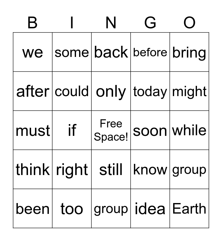 This bingo card has a free space and 29 words: been, how, if, just, we, back, could, right, soon, too, while, Earth, group, idea, might, start, still, think, bring, must, know, thought, today, after, before, some, group, only and o'clock.