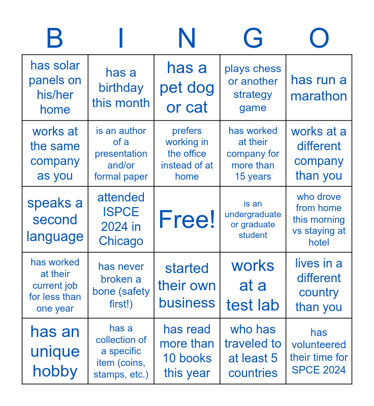 This bingo card has a free space and 28 words: lives in a different country than you, traveled over 10 hours to attend SPCE, has worked at their company for more than 15 years, who has traveled to at least 5 countries, works at the same company as you, has a pet dog or cat, has a birthday this month, has worked at their current job for less than one year, is an undergraduate or graduate student, has an unique hobby, speaks a second language, plays chess or another strategy game, has a collection of a specific item (coins, stamps, etc.), has read more than 10 books this year, works at a different company than you, volunteers for a local charity or organization, has never broken a bone (safety first!), is an author of a presentation and/or formal paper, prefers working in the office instead of at home, started their own business, has solar panels on his/her home, is a keynote speaker at ISPCE/SPCE, has volunteered their time for SPCE 2024, attended ISPCE 2024 in Chicago, who drove from home this morning vs staying at hotel, works at a test lab, has run a marathon and has been skydiving or bungee jumping.