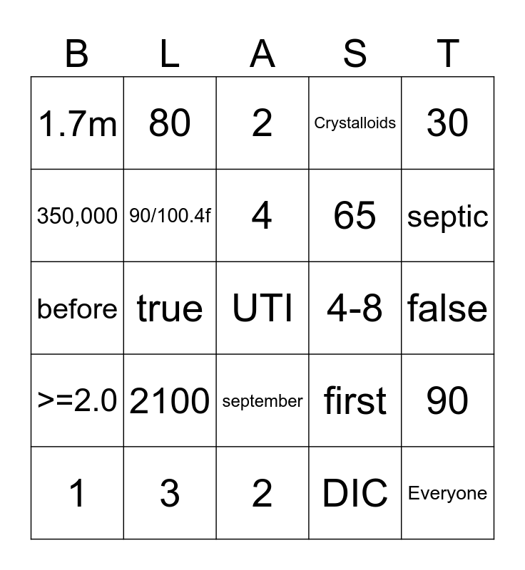 This bingo card has 25 words: 2100, 2, 4, 1, 30, 1.7m, 350,000, 80, 4-8, september, 65, before, first, 90, 90/100.4f, Everyone, false, 2, septic, true, UTI, 3, >=2.0, Crystalloids and DIC.