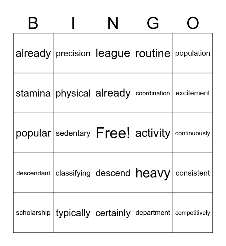 This bingo card has a free space and 29 words: scholarship, detrimental, sedentary, primarily, already, league, physical, classifying, activity, typically, continuously, competitively, certainly, department, excitement, ascend, descend, descendant, population, popular, heavy, competition, coordination, stamina, routine, precision, consistent, already and really.