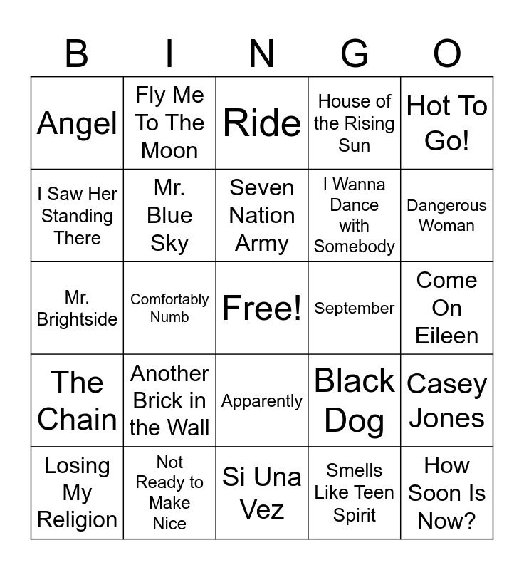 This bingo card has a free space and 24 words: Another Brick in the Wall, Not Ready to Make Nice, Seven Nation Army, Losing My Religion, Hot To Go!, Angel, I Saw Her Standing There, Fly Me To The Moon, September, Apparently, I Wanna Dance with Somebody, Mr. Brightside, Black Dog, Casey Jones, Mr. Blue Sky, Smells Like Teen Spirit, Come On Eileen, Ride, Dangerous Woman, Comfortably Numb, How Soon Is Now?, The Chain, House of the Rising Sun and Si Una Vez.