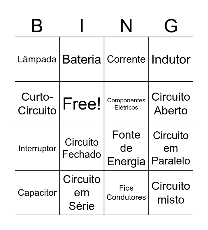 This bingo card has 16 words: Circuito em Série, Circuito em Paralelo, Corrente, Lâmpada, Interruptor, Bateria, Fonte de Energia, Fios Condutores, Curto-Circuito, Free!, Capacitor, Indutor, Circuito Fechado, Circuito Aberto, Componentes Elétricos and Circuito misto.