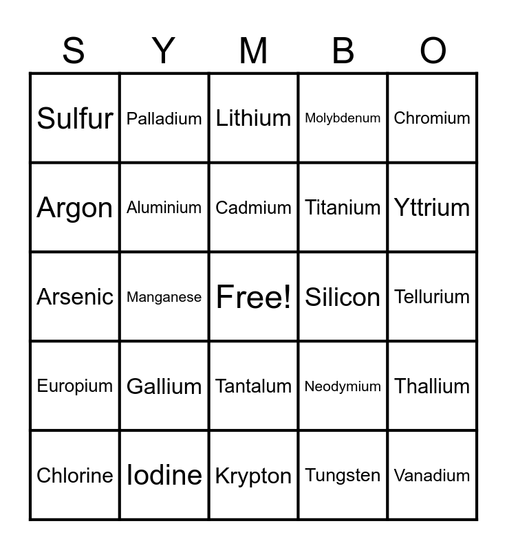 This bingo card has a free space and 82 words: H, Helium, Lithium, Beryllium, Boron, Carbon, Nitrogen, Oxygen, Fluorine, Neon, Sodium, Magnesium, Aluminium, Silicon, Phosphorus, Sulfur, Chlorine, Argon, Potassium, Calcium, Scandium, Titanium, Vanadium, Chromium, Manganese, Iron, Cobalt, Nickel, Copper, Zinc, Gallium, Germanium, Arsenic, Selenium, Bromine, Krypton, Rubidium, Strontium, Yttrium, Zirconium, Niobium, Molybdenum, Technetium, Ruthenium, Rhodium, Palladium, Silver, Cadmium, Indium, Tin, Antimony, Tellurium, Iodine, Xenon, Cesium, Barium, Lanthanum, Cerium, Praseodymium, Neodymium, Promethium, Samarium, Europium, Gadolinium, Terbium, Dysprosium, Holmium, Erbium, Thulium, Ytterbium, Lutetium, Hafnium, Tantalum, Tungsten, Rhenium, Osmium, Iridium, Platinum, Gold, Mercury, Thallium and Lead.