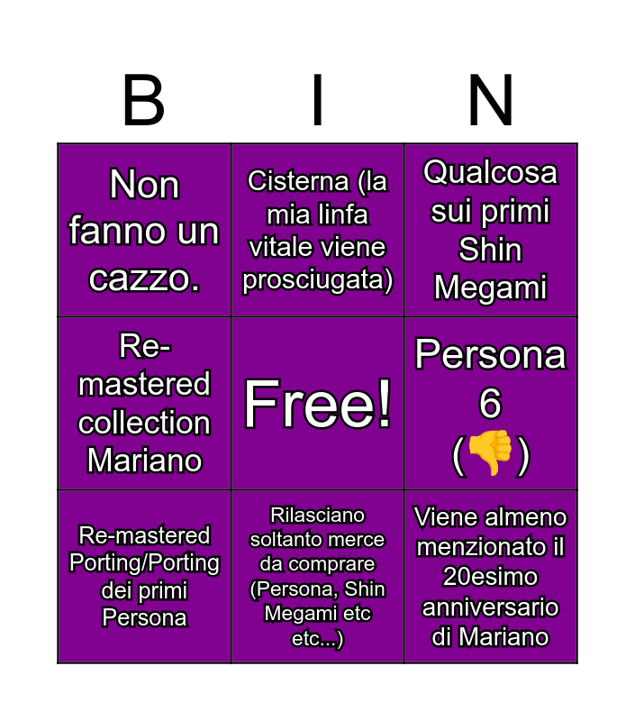 This bingo card has a free space and 8 words: Re-mastered collection Mariano, Cisterna (la mia linfa vitale viene prosciugata), Persona 6 (👎), Re-mastered Porting/Porting dei primi Persona, Qualcosa sui primi Shin Megami, Non fanno un cazzo., Rilasciano soltanto merce da comprare (Persona, Shin Megami etc etc...) and Viene almeno menzionato il 20esimo anniversario di Mariano.