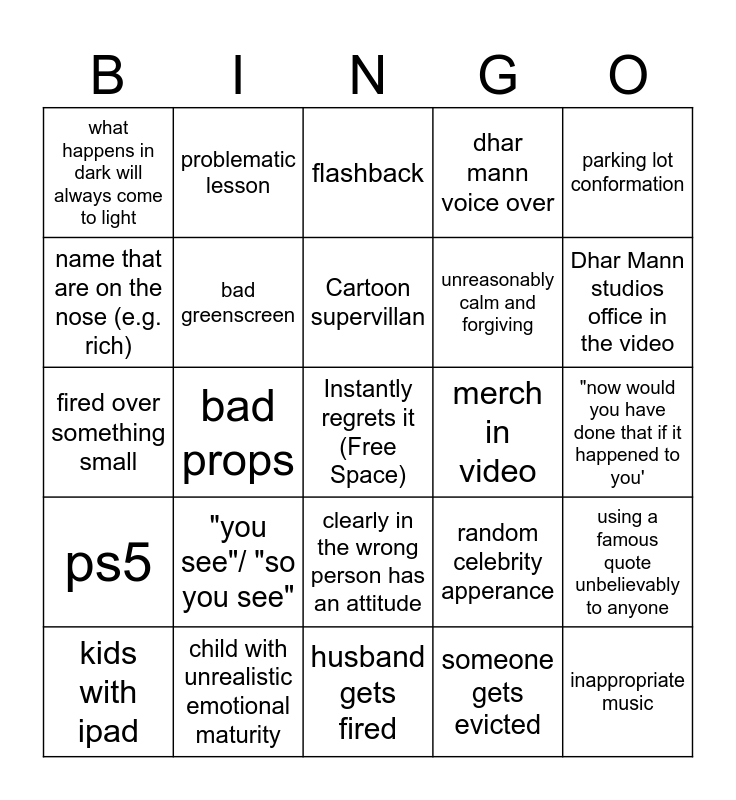This bingo card has a free space and 24 words: "you see"/ "so you see", child with unrealistic emotional maturity, Cartoon supervillan, kids with ipad, parking lot conformation, what happens in dark will always come to light, name that are on the nose (e.g. rich), problematic lesson, merch in video, clearly in the wrong person has an attitude, unreasonably calm and forgiving, fired over something small, random celebrity apperance, using a famous quote unbelievably to anyone, bad greenscreen, someone gets evicted, "now would you have done that if it happened to you', flashback, Dhar Mann studios office in the video, bad props, inappropriate music, ps5, dhar mann voice over and husband gets fired.