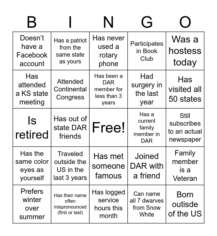 This bingo card has a free space and 48 words: Family member currently serving in the military, Born outisde of the US, Wearing a DAR pin today, Has logged service hours this month, Traveled outside the US in the last 3 years, Has a child or grandchild under the age of 3, Has a patriot from the same state as yours, Completed the member course, Has attended a KS state meeting, Has been a DAR member for 10+ years, Attended Continental Congress, Participates in Book Club, Family member is a Veteran, Joined DAR with a friend, Participated in the Lenexa 4th of July Parade this year, Brought a new member into DAR, Has been a DAR member for less than 3 years, Has a current family member in DAR, Favorite part of the meeting is the program, Was a hostess today, Has out of state DAR friends, Can name all 7 dwarves from Snow White, Doesn’t have a Facebook account, Had surgery in the last year, Is a member of the chapter Facebook group, Has visited all 50 states, Prefers winter over summer, Has been married to same person for 25+ years, Has met someone famous, Has the same color eyes as yourself, Has been on a blind date, Has been on three or more continents, Is an early bird on the weekends, Bites their fingernails, Has their name often mispronounced (first or last), Has shaken hands with a US President or First Lady, Has naturally curly hair, Still subscribes to an actual newspaper, Can sew, Has been a teacher (of any kind), Is the youngest child, Has never had Starbuck's coffee, Has never used a rotary phone, Has worked for the same employer 10+ years, Is retired, Has never received a speeding ticket, Has Grandchildren that believe in Santa and Can recite the preamble of the Constitution.