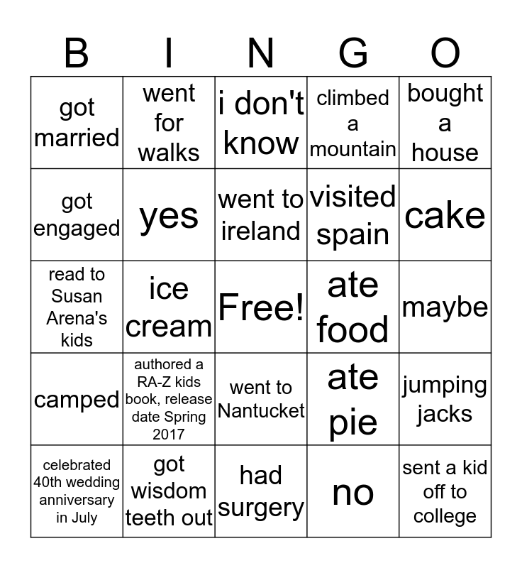 This bingo card has a free space and 24 words: authored a RA-Z kids book, release date Spring 2017, got wisdom teeth out, went to ireland, celebrated 40th wedding anniversary in July, bought a house, got married, got engaged, went for walks, ate food, went to Nantucket, visited spain, read to Susan Arena's kids, ate pie, jumping jacks, yes, no, maybe, i don't know, cake, ice cream, sent a kid off to college, camped, climbed a mountain and had surgery.