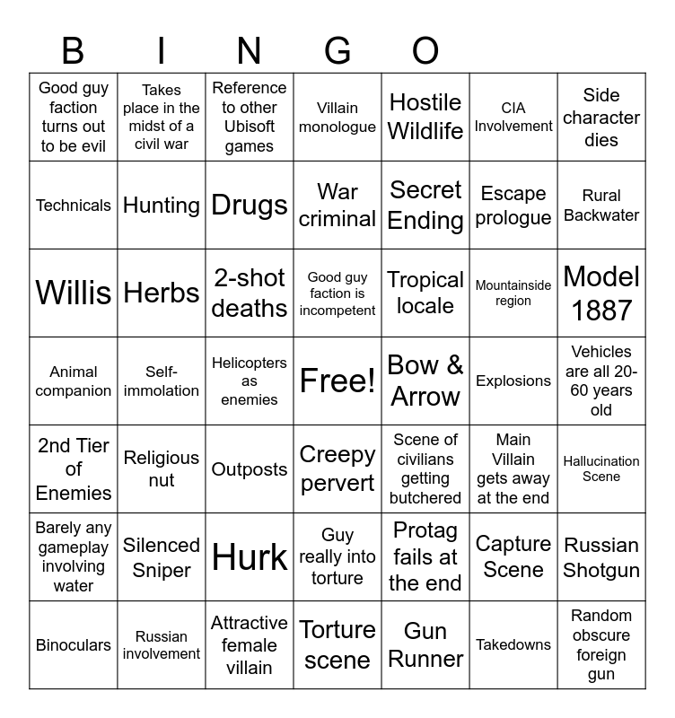 This bingo card has a free space and 48 words: Protag fails at the end, Escape prologue, Torture scene, Self-immolation, 2-shot deaths, Vehicles are all 20-60 years old, Takes place in the midst of a civil war, Russian involvement, CIA Involvement, Creepy pervert, Side character dies, Villain monologue, Mountainside region, Tropical locale, Barely any gameplay involving water, Explosions, Technicals, Rural Backwater, Capture Scene, Hostile Wildlife, Secret Ending, Helicopters as enemies, Good guy faction turns out to be evil, Hunting, Russian Shotgun, Drugs, Model 1887, Binoculars, Good guy faction is incompetent, Herbs, Takedowns, Bow & Arrow, Hallucination Scene, Silenced Sniper, Animal companion, Scene of civilians getting butchered, Main Villain gets away at the end, Willis, Outposts, Hurk, 2nd Tier of Enemies, Random obscure foreign gun, Reference to other Ubisoft games, Attractive female villain, War criminal, Guy really into torture, Religious nut and Gun Runner.