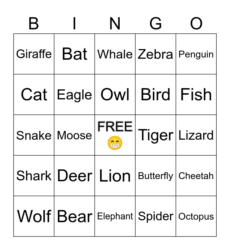 This bingo card has a free space and 24 words: Deer, Bear, Owl, Wolf, Penguin, Giraffe, Cat, Bat, Tiger, Lion, Bird, Snake, Butterfly, Cheetah, Eagle, Spider, Lizard, Whale, Fish, Moose, Octopus, Shark, Zebra and Elephant.