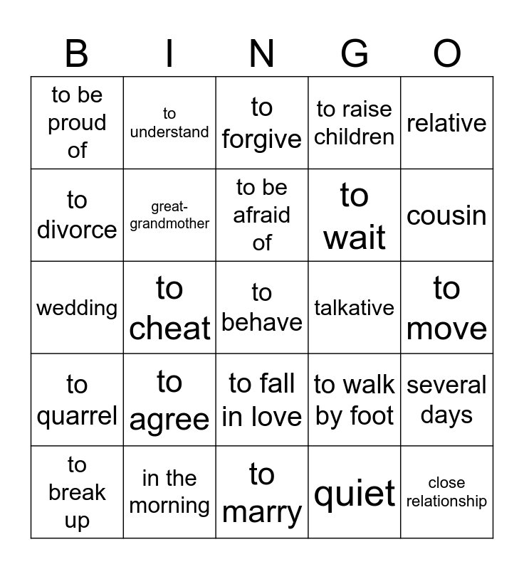 This bingo card has a free space and 24 words: to agree, in the morning, to be afraid of, to break up, relative, to be proud of, to divorce, to understand, talkative, to fall in love, to wait, wedding, to walk by foot, several days, great-grandmother, quiet, to move, to forgive, cousin, to cheat, close relationship, to quarrel, to raise children and to marry.