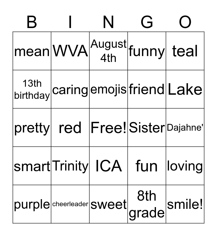 This bingo card has a free space and 24 words: Trinity, cheerleader, emojis, purple, teal, mean, 13th birthday, WVA, Sister, ICA, friend, pretty, fun, loving, caring, 8th grade, Dajahne', August 4th, Lake, red, smile!, smart, funny and sweet.