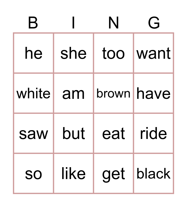 This bingo card has 16 words: like, ride, too, he, saw, she, eat, get, white, am, so, want, but, have, brown and black.