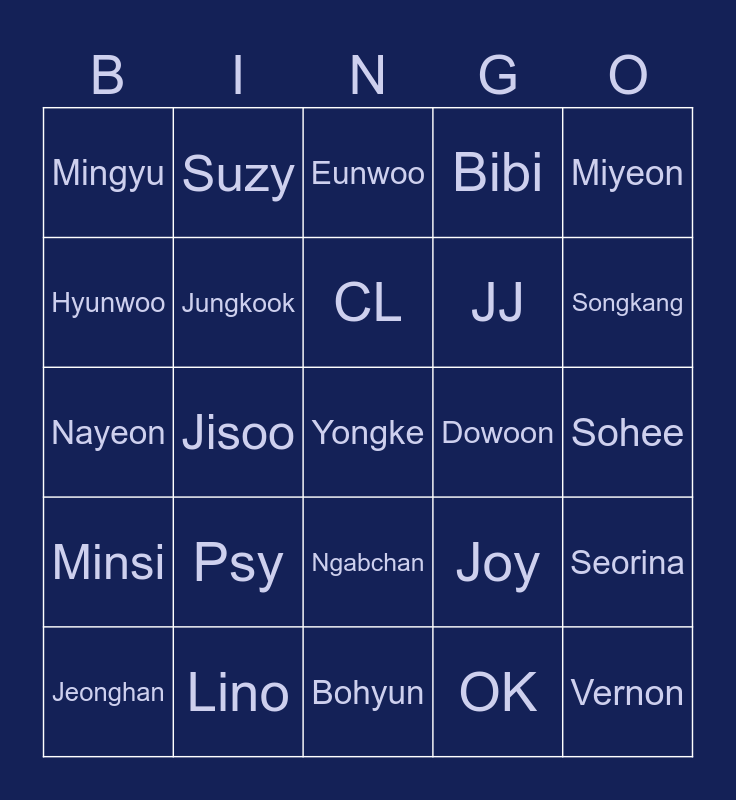 This bingo card has a free space and 24 words: Psy, Lino, CL, Jeonghan, Miyeon, Mingyu, Hyunwoo, Suzy, Dowoon, Ngabchan, JJ, Nayeon, Joy, Seorina, Jungkook, OK, Sohee, Eunwoo, Songkang, Jisoo, Vernon, Minsi, Bibi and Bohyun.