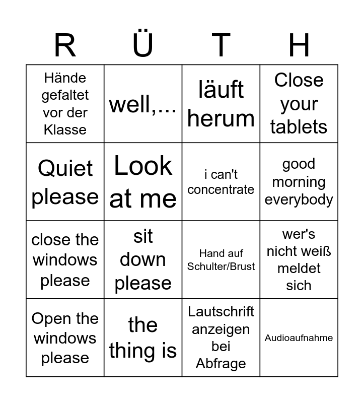 This bingo card has 16 words: the thing is, wer's nicht weiß meldet sich, läuft herum, Hände gefaltet vor der Klasse, close the windows please, well,..., Hand auf Schulter/Brust, Lautschrift anzeigen bei Abfrage, Quiet please, Look at me, Open the windows please, Close your tablets, sit down please, good morning everybody, i can't concentrate and Audioaufnahme.
