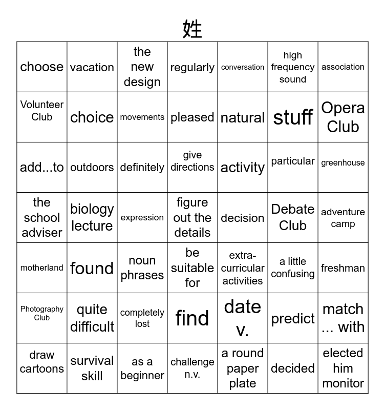 This bingo card has a free space and 48 words: date v., stuff, challenge n.v., biology lecture, definitely, adventure camp, vacation, survival skill, high frequency sound, be suitable for, association, regularly, particular, activity, Photography Club, Debate Club, Volunteer Club, Opera Club, predict, conversation, natural, expression, choose, choice, match ... with, movements, greenhouse, draw cartoons, give directions, outdoors, decided, decision, freshman, quite difficult, the school adviser, extra-curricular activities, a little confusing, add...to, noun phrases, completely lost, motherland, elected him monitor, the new design, as a beginner, pleased, find, found and a round paper plate.