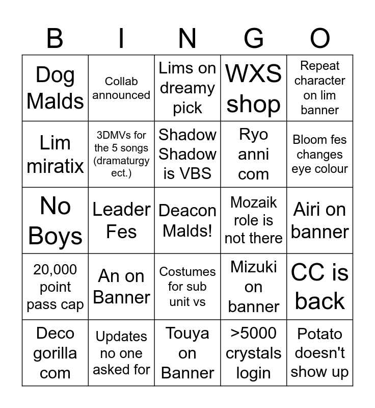 This bingo card has a free space and 24 words: An on Banner, Updates no one asked for, Shadow Shadow is VBS, Deco gorilla com, Repeat character on lim banner, Dog Malds, Lim miratix, Collab announced, Mozaik role is not there, Costumes for sub unit vs, Ryo anni com, No Boys, Mizuki on banner, CC is back, 3DMVs for the 5 songs (dramaturgy ect.), >5000 crystals login, Airi on banner, Lims on dreamy pick, Bloom fes changes eye colour, Leader Fes, Potato doesn't show up, 20,000 point pass cap, WXS shop and Touya on Banner.