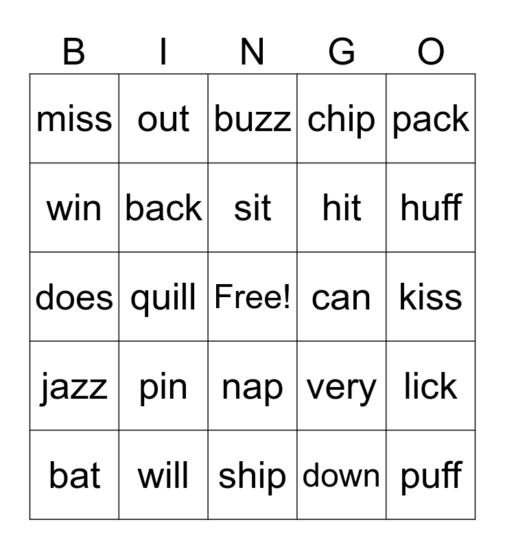 This bingo card has a free space and 24 words: pin, will, sit, bat, pack, miss, win, out, can, nap, hit, does, very, lick, back, down, kiss, buzz, huff, quill, puff, jazz, chip and ship.